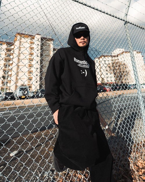 広めにとった身幅と絶妙な肩落ち具合のゆったりとしたシルエット、大きめフードのプルオーバーフーディ。
